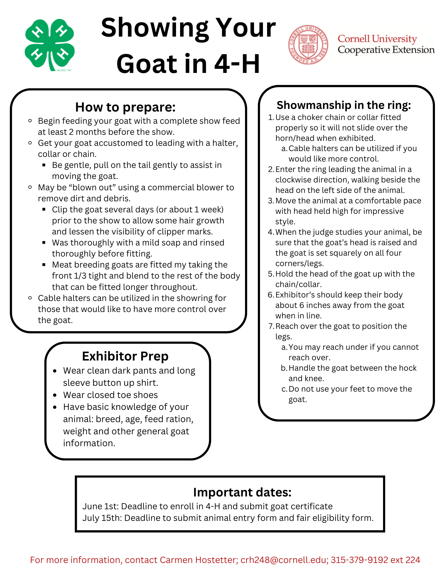 - Leased goats must have Lease Goat Identification form turned into Cornell Cooperative Extension by June 15th.